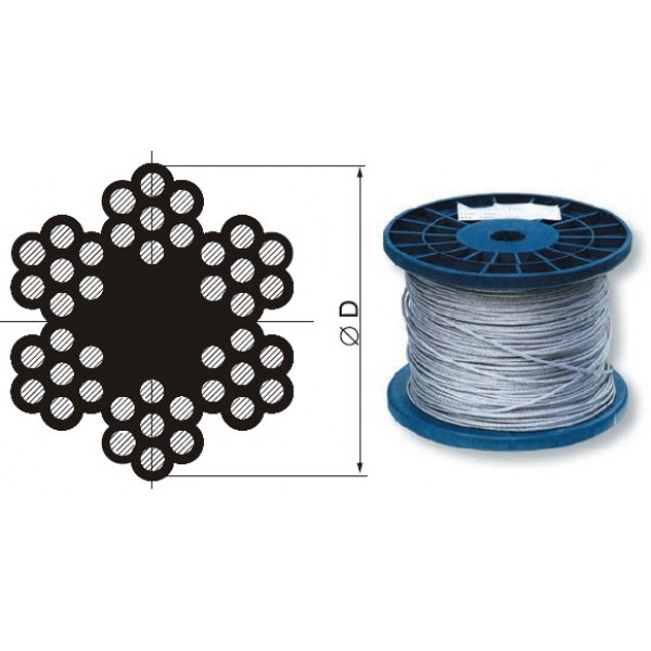 Предназначен для растяжки, не применяют для подъема тяжестей. С его помощью фиксируют элементы конструкций. Сделан из проволоки и сердечника. Стальная поволока покрыта белым цинком, в каждую из 6 прядей заплетено по 7 прутиков. Сердцевина неметаллическая, пропитана антикоррозийной смазкой. Трос DIN применяется в строительстве, монтажных работах, такелаже.